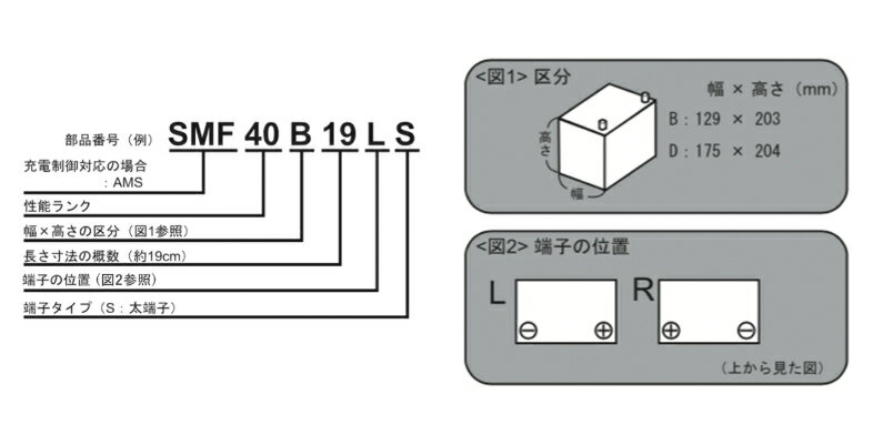 SMF40B19R 5時間率容量(Ah) 長さ(mm) 幅(mm) 総高さ(mm) RC(分)※1 CCA(アンペア)※2 端子位置 端子タイプ ハンドル 28 187 127 227 52 332 R 細 付 ※1 RC(分):リザーブキャパシティ ※2 CCA(アンペア):コールドクランキングアンペア ●サイズの見方●